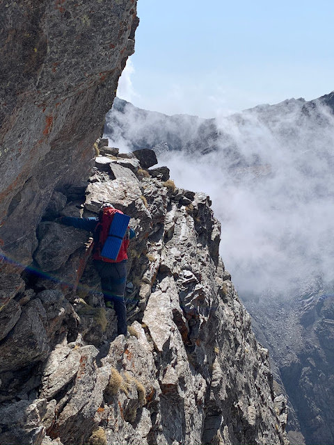 El pasado fin de semana (sábado 19 y domingo 20 de septiembre) nos juntamos Matt Wildness, Sebas y un servidor para realizar el Espolón de la Alcazaba desde su basar. Son 400m de trepadas con algunos pasos de II y III. El punto mas aéreo es una cornisa de unos 15 m pero con buenos agarres a la que se llega tras dos largos de unos 15/20m y un diedro que da entrada a esta. Bajamos hacia Siete Lagunas por el colaero donde montamos vivac (en laguna altera huyendo de las 25 tiendas de campaña montadas en la hondura) y pasamos la noche (algo movidita con el viento y el frio). A la mañana siguiente nos preparamos para bajar a Campaneira en bus done nos esperaban Victor y Kiki para realizar el barranco de "Tajo Cortes"